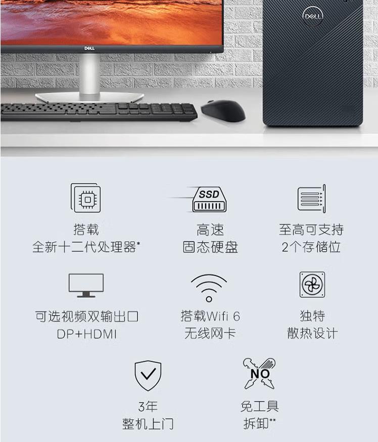 戴爾(DELL)靈越3910-18N6家用辦公學習網課娛樂臺式電腦主機12代i5 16G 256G+1T獨顯 加27英寸全高清顯示器(S2721NX)